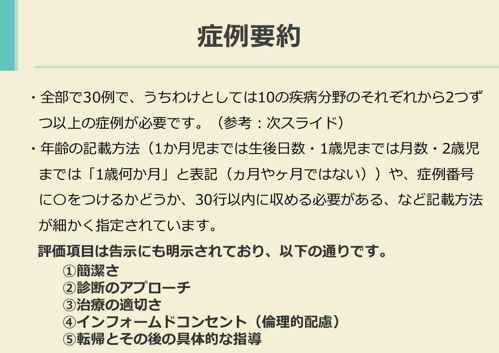 #20. 症例要約 ・全部で30例で、うちわけとしては10の疾病分野のそれぞれから2つず つ以上の症例が必要です。(参考:次スライド) ・年齢の記載方法(1か月児までは生後日数・1歳児までは月数・2歳児 までは「1歳何か月」と表記(ヵ月やヶ月ではない))や、症例番号 に〇をつけるかどうか、30行以内に収める必要がある、など記載方法 が細かく指定されています。 評価項目は告示にも明示されており、以下の通りです。 ①簡潔さ ②診断のアプローチ ③治療の適切さ ④インフォームドコンセント(倫理的配慮) ⑤転帰とその後の具体的な指導