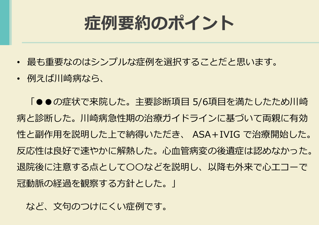 #21. 症例要約のポイント • 最も重要なのはシンプルな症例を選択することだと思います。 • 例えば川崎病なら、 「●●の症状で来院した。主要診断項目 5/6項目を満たしたため川崎 病と診断した。川崎病急性期の治療ガイドラインに基づいて両親に有効 性と副作用を説明した上で納得いただき、 ASA+IVIG で治療開始した。 反応性は良好で速やかに解熱した。心血管病変の後遺症は認めなかった。 退院後に注意する点として〇〇などを説明し、以降も外来で心エコーで 冠動脈の経過を観察する方針とした。」 など、文句のつけにくい症例です。