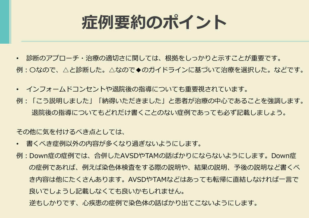 #22. 症例要約のポイント • 診断のアプローチ・治療の適切さに関しては、根拠をしっかりと示すことが重要です。 例:〇なので、△と診断した。△なので◆のガイドラインに基づいて治療を選択した。などです。 • インフォームドコンセントや退院後の指導についても重要視されています。 例:「こう説明しました」「納得いただきました」と患者が治療の中心であることを強調します。 退院後の指導についてもどれだけ書くことのない症例であっても必ず記載しましょう。 その他に気を付けるべき点としては、 • 書くべき症例以外の内容が多くなり過ぎないようにします。 例:Down症の症例では、合併したAVSDやTAMの話ばかりにならないようにします。Down症 の症例であれば、例えば染色体検査をする際の説明や、結果の説明、予後の説明など書くべ き内容は他にたくさんあります。AVSDやTAMなどはあっても転帰に直結しなければ一言で 良いでしょうし記載しなくても良いかもしれません。 逆もしかりです、心疾患の症例で染色体の話ばかり出てこないようにします。