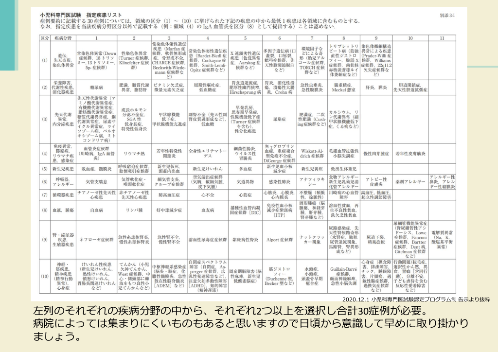 #23. 2020.12.1 小児科専門医試験認定プログラム制 告示より抜粋 左列のそれぞれの疾病分野の中から、それぞれ2つ以上を選択し合計30症例が必要。 病院によっては集まりにくいものもあると思いますので日頃から意識して早めに取り掛かり ましょう。
