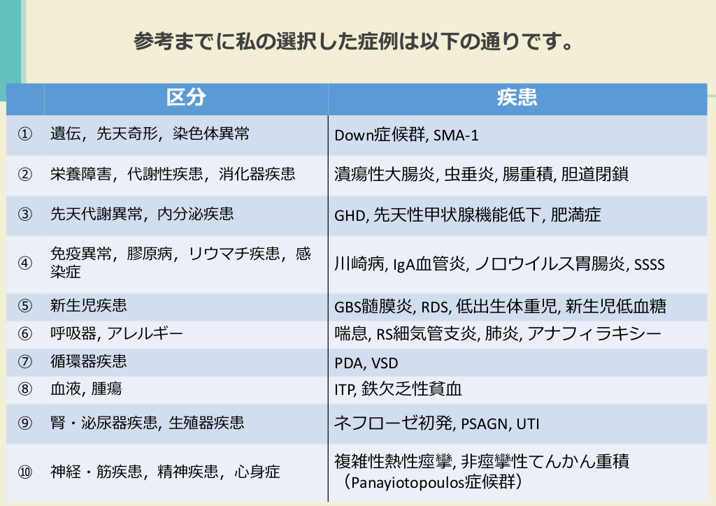#24. 参考までに私の選択した症例は以下の通りです。 区分 疾患 ① 遺伝,先天奇形,染色体異常 Down症候群, SMA-1 ② 栄養障害,代謝性疾患,消化器疾患 潰瘍性大腸炎, 虫垂炎, 腸重積, 胆道閉鎖 ③ 先天代謝異常,内分泌疾患 GHD, 先天性甲状腺機能低下, 肥満症 ④ 免疫異常,膠原病,リウマチ疾患,感 染症 川崎病, IgA血管炎, ノロウイルス胃腸炎, SSSS ⑤ 新生児疾患 GBS髄膜炎, RDS, 低出生体重児, 新生児低血糖 ⑥ 呼吸器, アレルギー 喘息, RS細気管支炎, 肺炎, アナフィラキシー ⑦ 循環器疾患 PDA, VSD ⑧ 血液, 腫瘍 ITP, 鉄欠乏性貧血 ⑨ 腎・泌尿器疾患, 生殖器疾患 ネフローゼ初発, PSAGN, UTI ⑩ 神経・筋疾患,精神疾患,心身症 複雑性熱性痙攣, 非痙攣性てんかん重積 (Panayiotopoulos症候群)