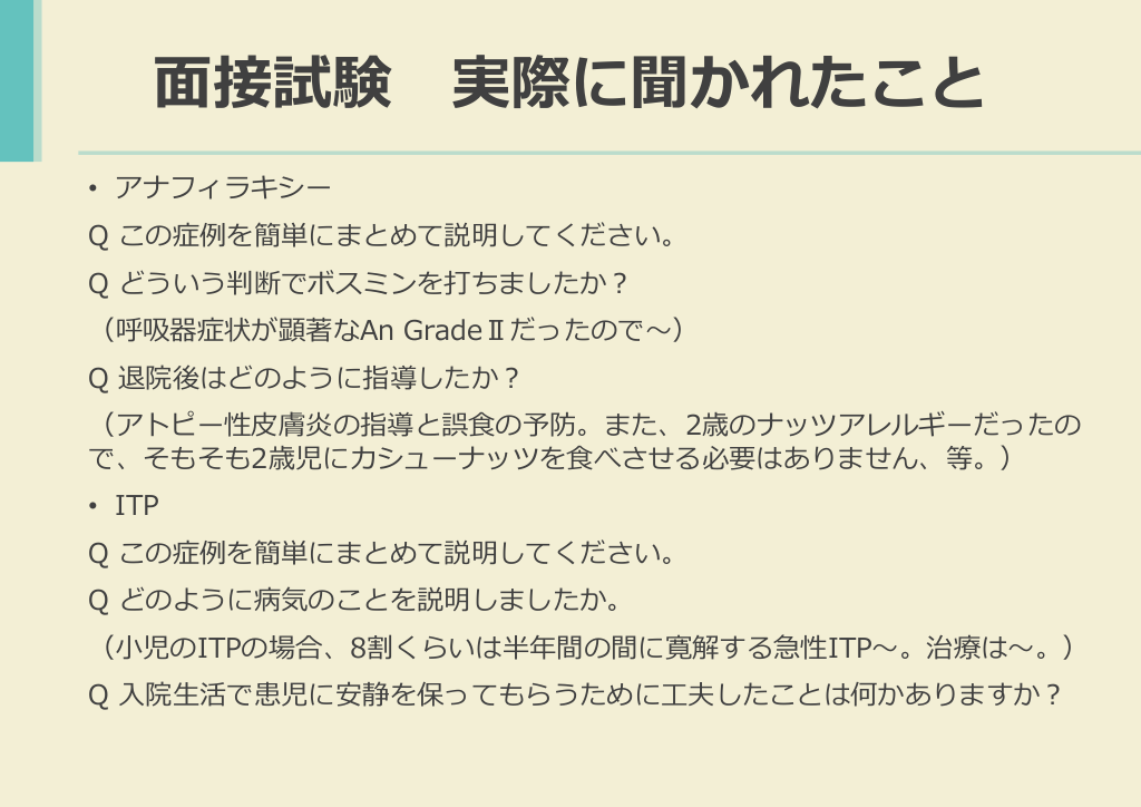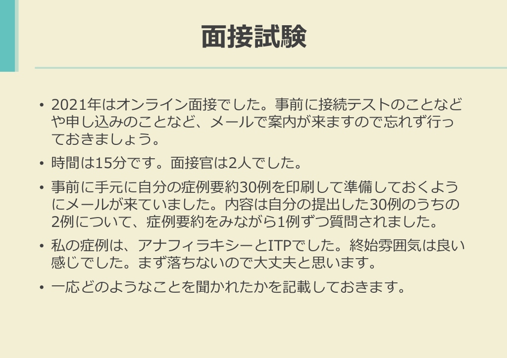 #25. 面接試験 • 2021年はオンライン面接でした。事前に接続テストのことなど や申し込みのことなど、メールで案内が来ますので忘れず行っ ておきましょう。 • 時間は15分です。面接官は2人でした。 • 事前に手元に自分の症例要約30例を印刷して準備しておくよう にメールが来ていました。内容は自分の提出した30例のうちの 2例について、症例要約をみながら1例ずつ質問されました。 • 私の症例は、アナフィラキシーとITPでした。終始雰囲気は良い 感じでした。まず落ちないので大丈夫と思います。 • 一応どのようなことを聞かれたかを記載しておきます。