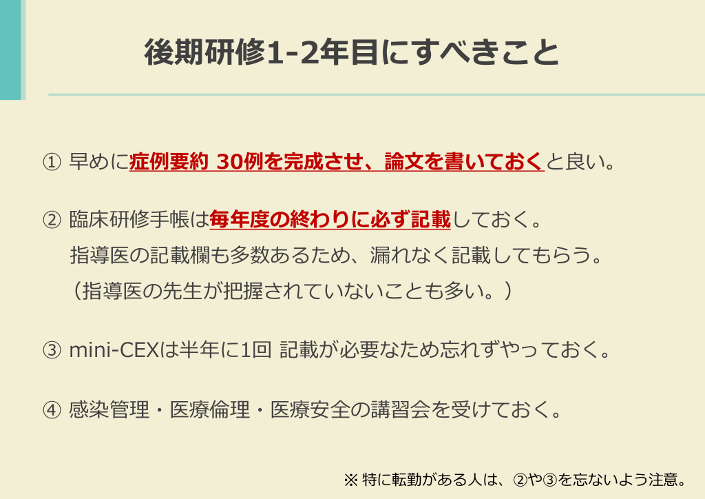 #4. 後期研修1-2年目にすべきこと ① 早めに症例要約 30例を完成させ、論文を書いておくと良い。 ② 臨床研修手帳は毎年度の終わりに必ず記載しておく。 指導医の記載欄も多数あるため、漏れなく記載してもらう。 (指導医の先生が把握されていないことも多い。) ③ mini-CEXは半年に1回 記載が必要なため忘れずやっておく。 ④ 感染管理・医療倫理・医療安全の講習会を受けておく。 ※ 特に転勤がある人は、②や③を忘ないよう注意。