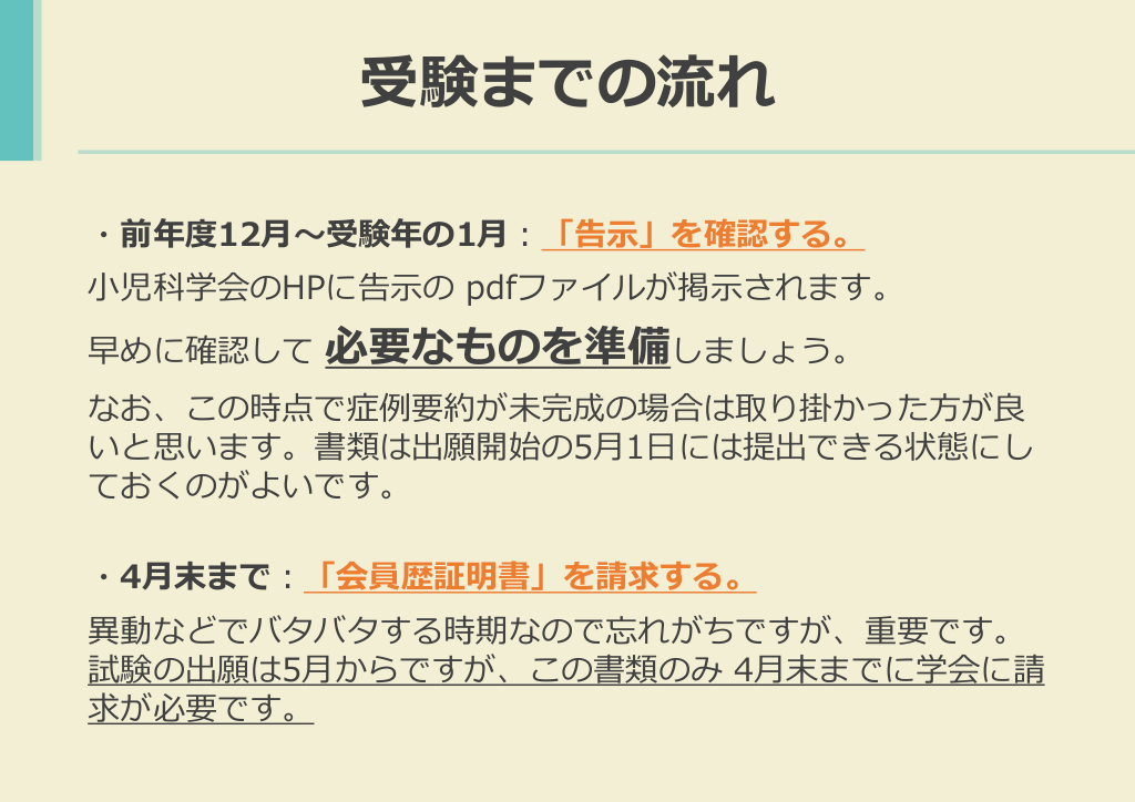 #5. 受験までの流れ ・前年度12月~受験年の1月:「告示」を確認する。 小児科学会のHPに告示の pdfファイルが掲示されます。 早めに確認して 必要なものを準備しましょう。 なお、この時点で症例要約が未完成の場合は取り掛かった方が良 いと思います。書類は出願開始の5月1日には提出できる状態にし ておくのがよいです。 ・4月末まで:「会員歴証明書」を請求する。 異動などでバタバタする時期なので忘れがちですが、重要です。 試験の出願は5月からですが、この書類のみ 4月末までに学会に請 求が必要です。