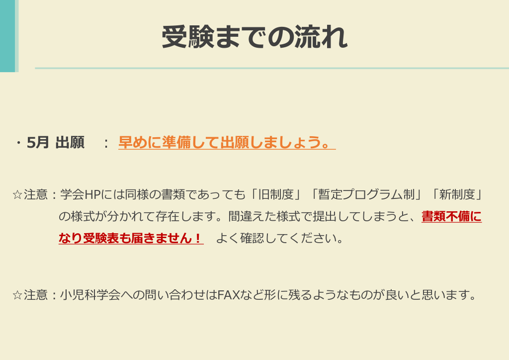 #6. 受験までの流れ ・5月 出願 : 早めに準備して出願しましょう。 ☆注意:学会HPには同様の書類であっても「旧制度」「暫定プログラム制」「新制度」 の様式が分かれて存在します。間違えた様式で提出してしまうと、書類不備に なり受験表も届きません! よく確認してください。 ☆注意:小児科学会への問い合わせはFAXなど形に残るようなものが良いと思います。