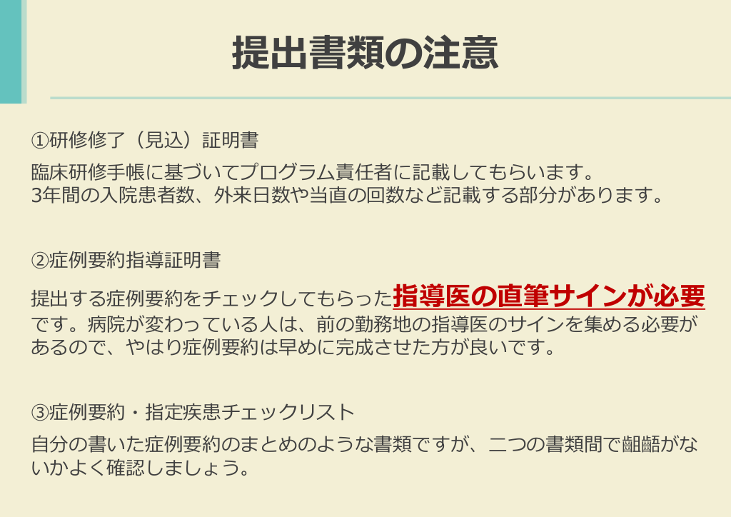 #8. 提出書類の注意 ①研修修了(見込)証明書 臨床研修手帳に基づいてプログラム責任者に記載してもらいます。 3年間の入院患者数、外来日数や当直の回数など記載する部分があります。 ②症例要約指導証明書 提出する症例要約をチェックしてもらった指導医の直筆サインが必要 です。病院が変わっている人は、前の勤務地の指導医のサインを集める必要が あるので、やはり症例要約は早めに完成させた方が良いです。 ③症例要約・指定疾患チェックリスト 自分の書いた症例要約のまとめのような書類ですが、二つの書類間で齟齬がな いかよく確認しましょう。