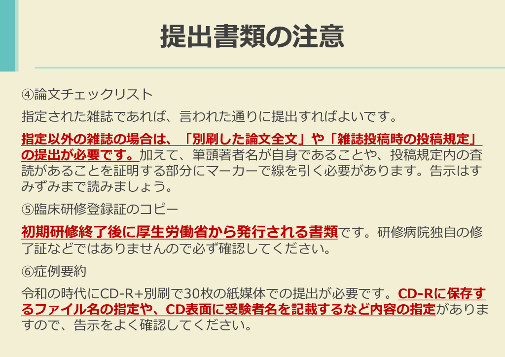 #9. 提出書類の注意 ④論文チェックリスト 指定された雑誌であれば、言われた通りに提出すればよいです。 指定以外の雑誌の場合は、「別刷した論文全文」や「雑誌投稿時の投稿規定」 の提出が必要です。加えて、筆頭著者名が自身であることや、投稿規定内の査 読があることを証明する部分にマーカーで線を引く必要があります。告示はす みずみまで読みましょう。 ⑤臨床研修登録証のコピー 初期研修終了後に厚生労働省から発行される書類です。研修病院独自の修 了証などではありませんので必ず確認してください。 ⑥症例要約 令和の時代にCD-R+別刷で30枚の紙媒体での提出が必要です。CD-Rに保存す るファイル名の指定や、CD表面に受験者名を記載するなど内容の指定がありま すので、告示をよく確認してください。