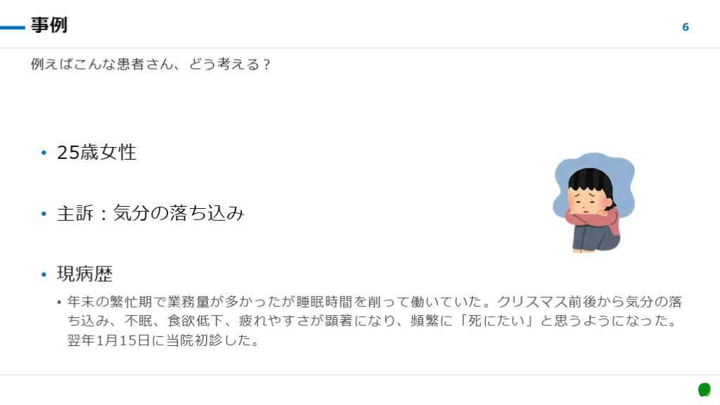 年末の繁忙期で業務量が多かったが睡眠時間を削って働いていた。クリスマス前後から気分の落ち込み、不眠、食欲低下、疲れやすさが顕著になり、頻繁に「死にたい」と思うようになった。翌年1月15日に当院初診した。 事例 例えばこんな患者さん、どう考える?