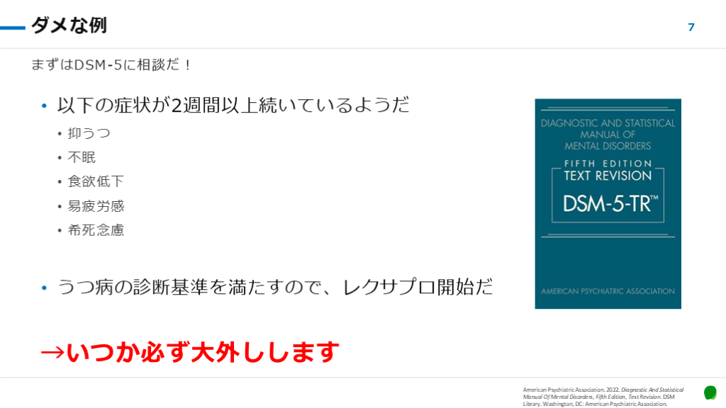 ダメな例 まずはDSM-5に相談だ! American Psychiatric Association. 2022. Diagnostic And Statistical Manual Of Mental Disorders, Fifth Edition, Text Revision. DSM Library. Washington, DC: American Psychiatric Association.