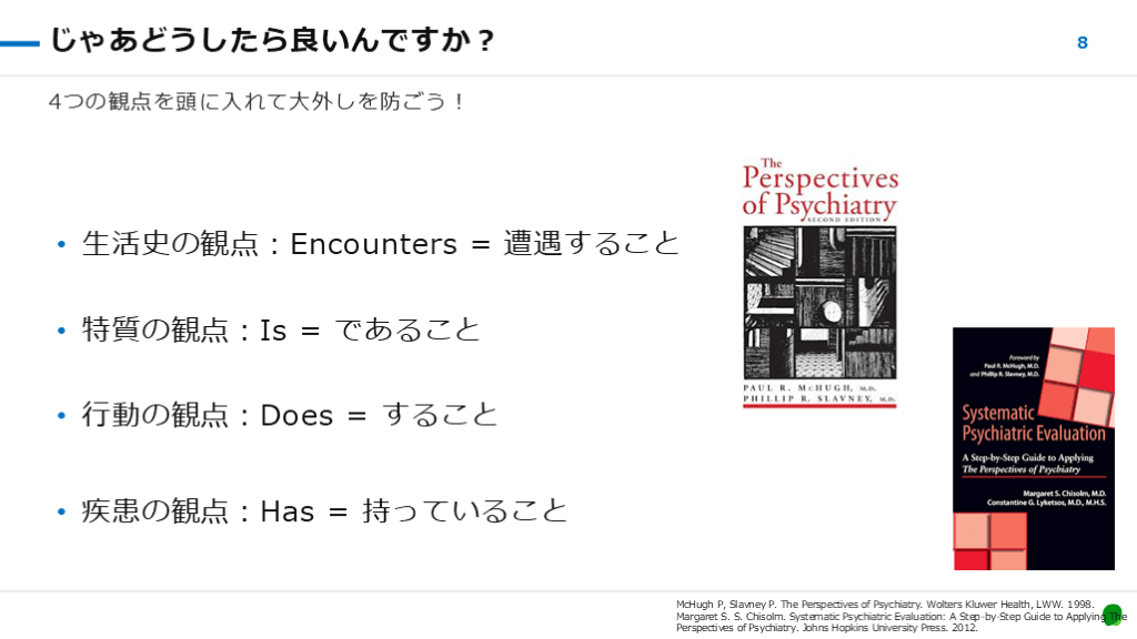 疾患の観点:Has = 持っていること じゃあどうしたら良いんですか? 4つの観点を頭に入れて大外しを防ごう! McHugh P, Slavney P. The Perspectives of Psychiatry. Wolters Kluwer Health, LWW. 1998.