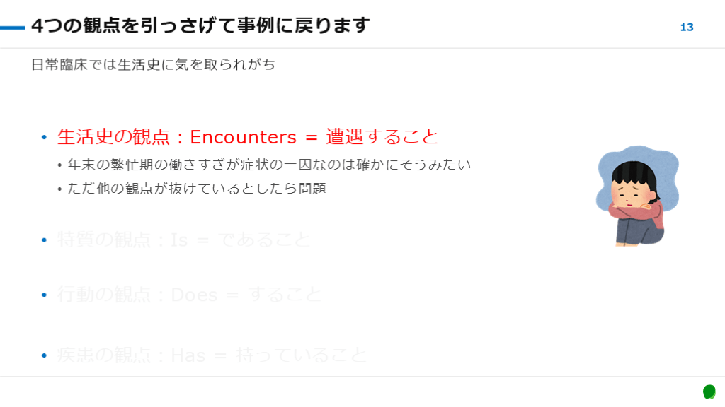 疾患の観点:Has = 持っていること 4つの観点を引っさげて事例に戻ります 日常臨床では生活史に気を取られがち