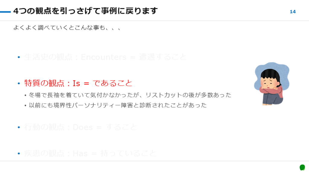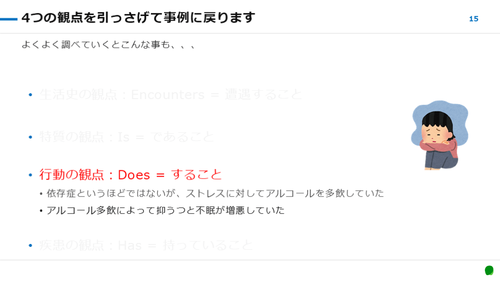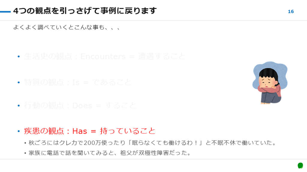 疾患の観点:Has = 持っていること 4つの観点を引っさげて事例に戻ります よくよく調べていくとこんな事も、、、