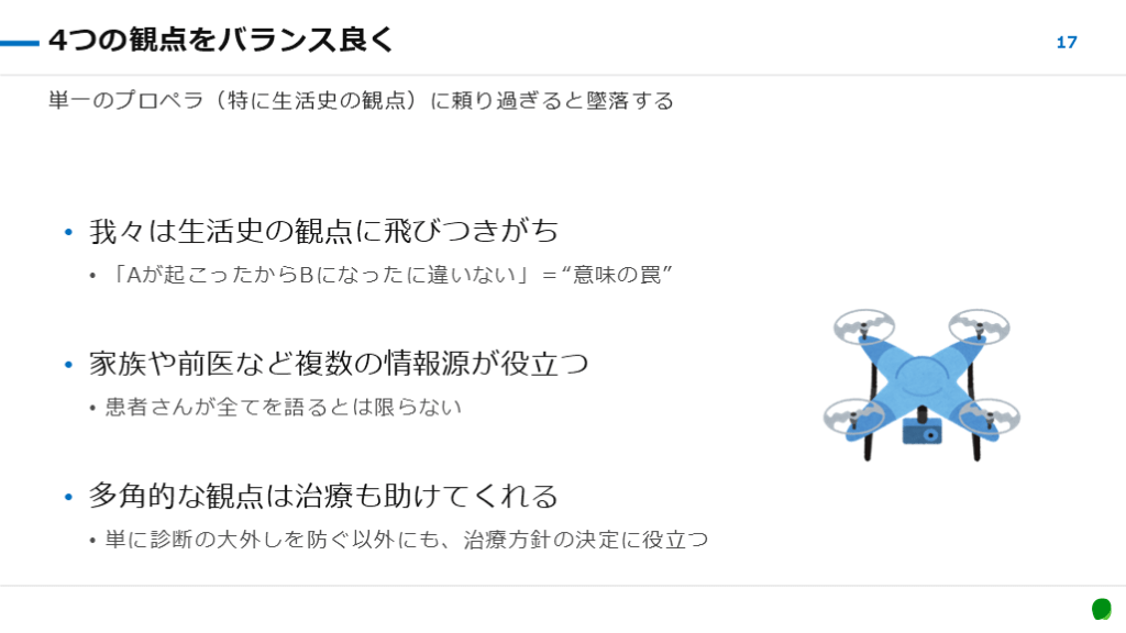 単に診断の大外しを防ぐ以外にも、治療方針の決定に役立つ 4つの観点をバランス良く 単一のプロペラ(特に生活史の観点)に頼り過ぎると墜落する