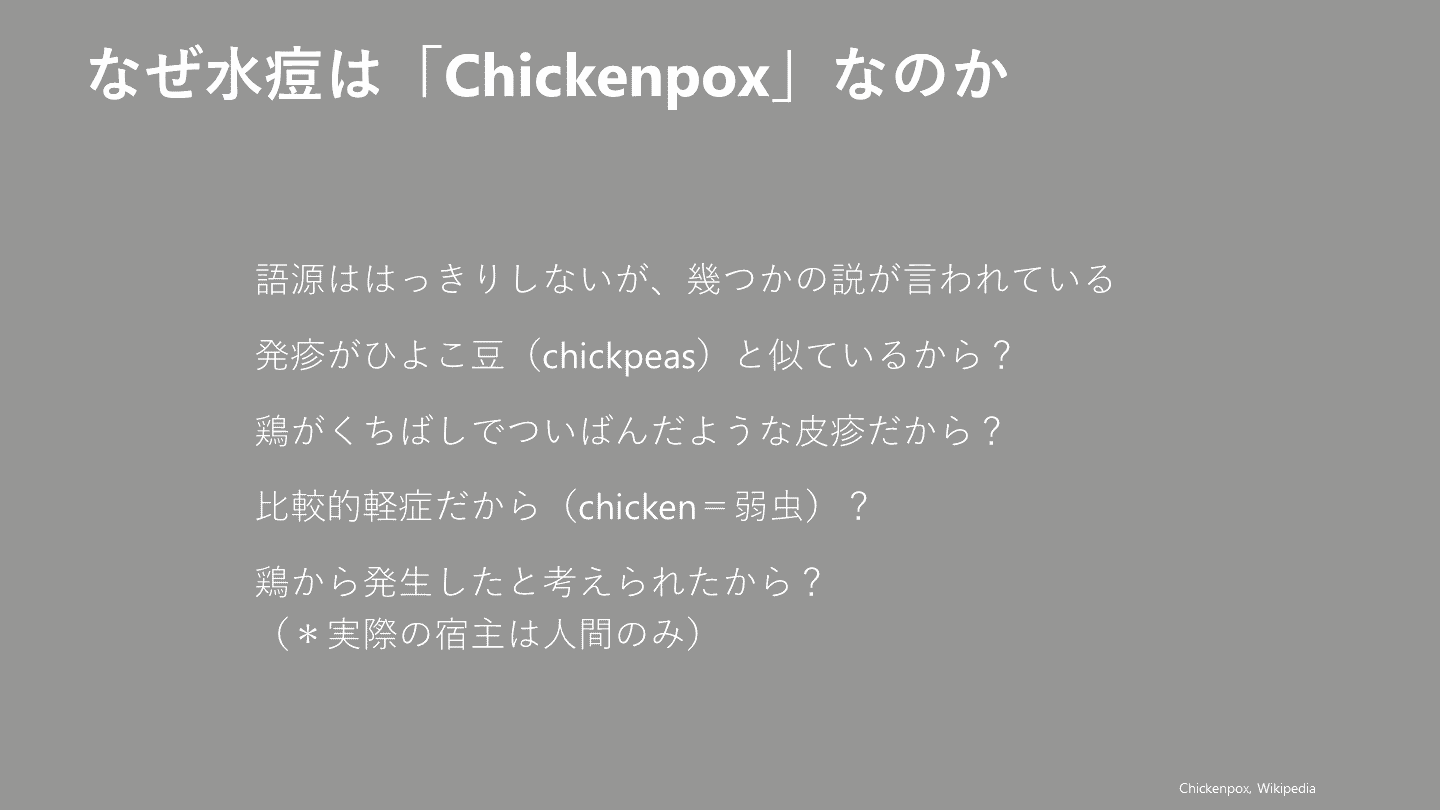 #2. なぜ水痘は「Chickenpox」なのか Chickenpox, Wikipedia 語源ははっきりしないが、幾つかの説が言われている