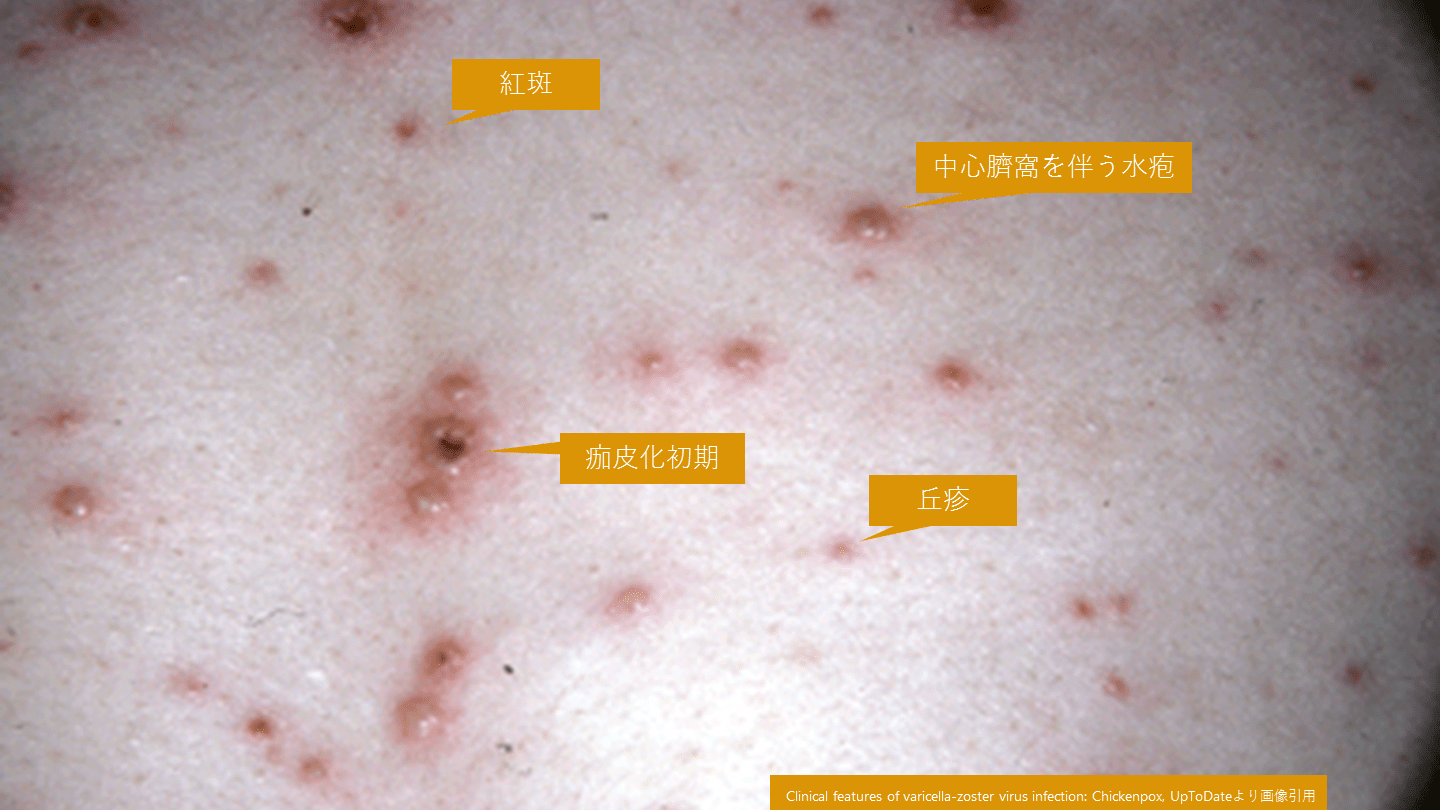 #10. Clinical features of varicella-zoster virus infection: Chickenpox, UpToDateより画像引用 紅斑 丘疹 中心臍窩を伴う水疱 痂皮化初期