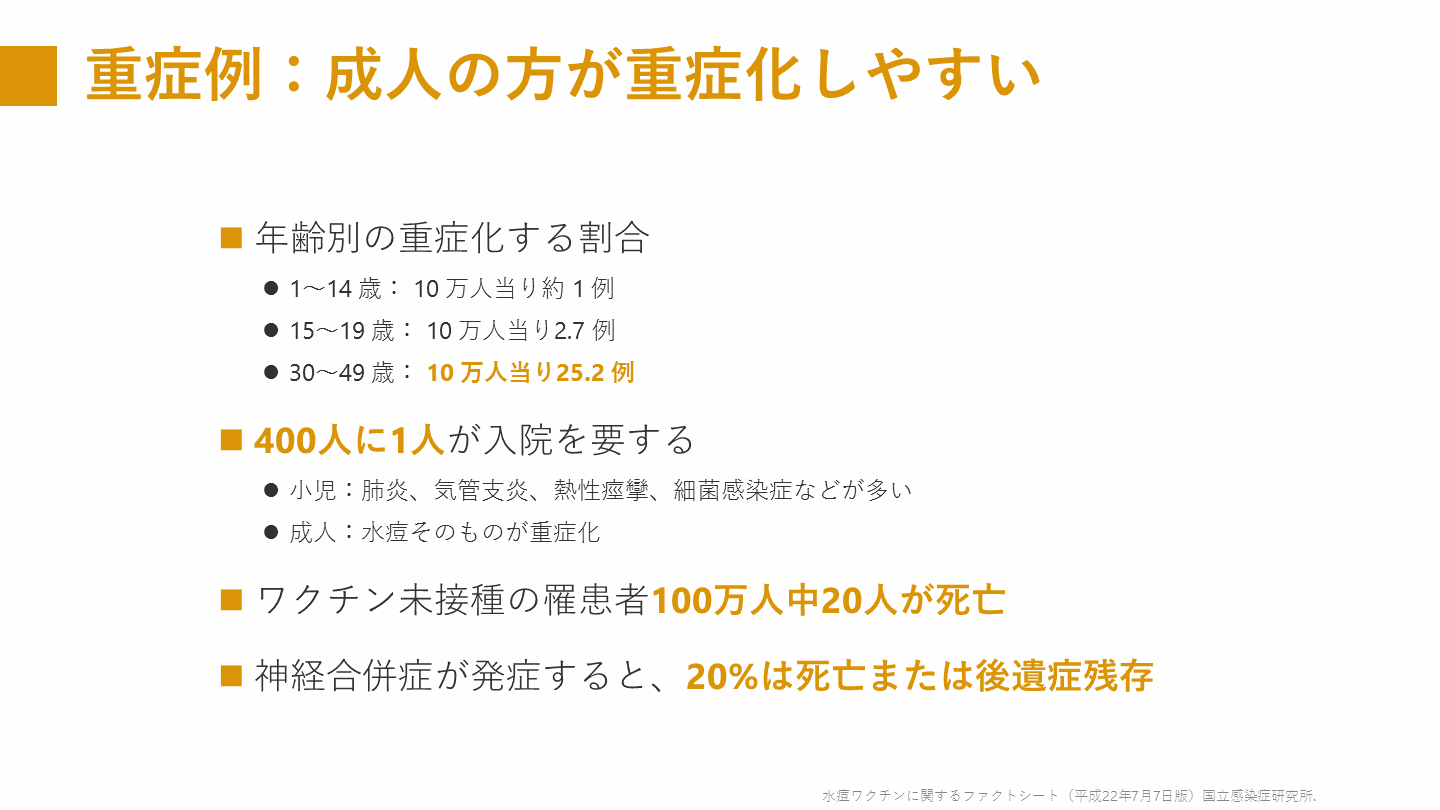#13. 重症例:成人の方が重症化しやすい 水痘ワクチンに関するファクトシート(平成22年7月7日版)国立感染症研究所. 年齢別の重症化する割合