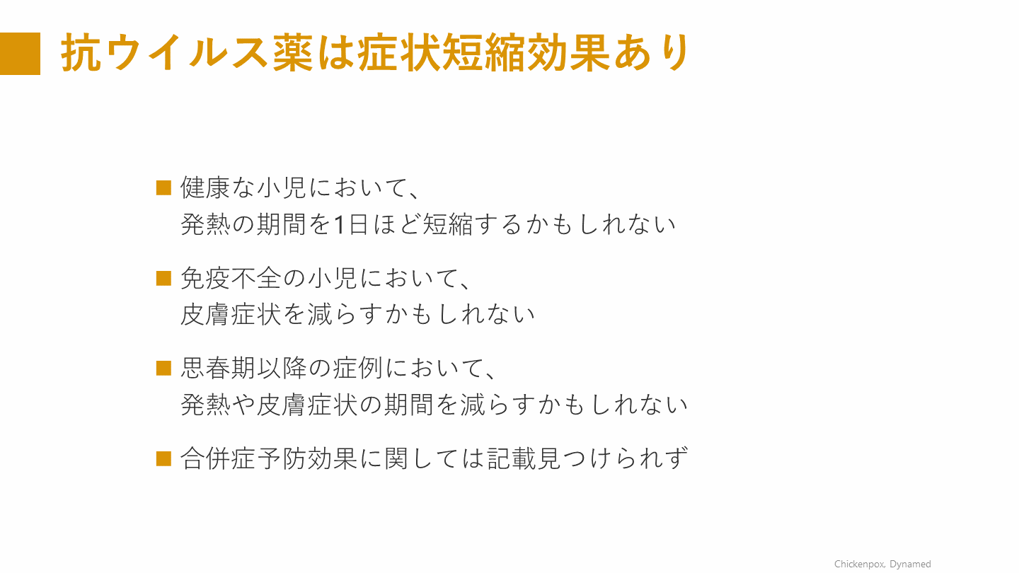#20. 抗ウイルス薬は症状短縮効果あり Chickenpox, Dynamed 健康な小児において、発熱の期間を1日ほど短縮するかもしれない