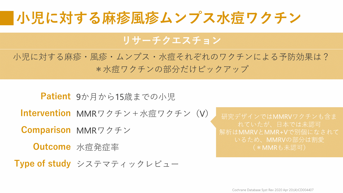 #22. 小児に対する麻疹風疹ムンプス水痘ワクチン Cochrane Database Syst Rev 2020 Apr 20;(4):CD004407 Patient 9か月から15歳までの小児 リサーチクエスチョン Intervention MMRワクチン+水痘ワクチン(V) Comparison MMRワクチン Outcome 水痘発症率 Type of study システマティックレビュー 小児に対する麻疹・風疹・ムンプス・水痘それぞれのワクチンによる予防効果は?