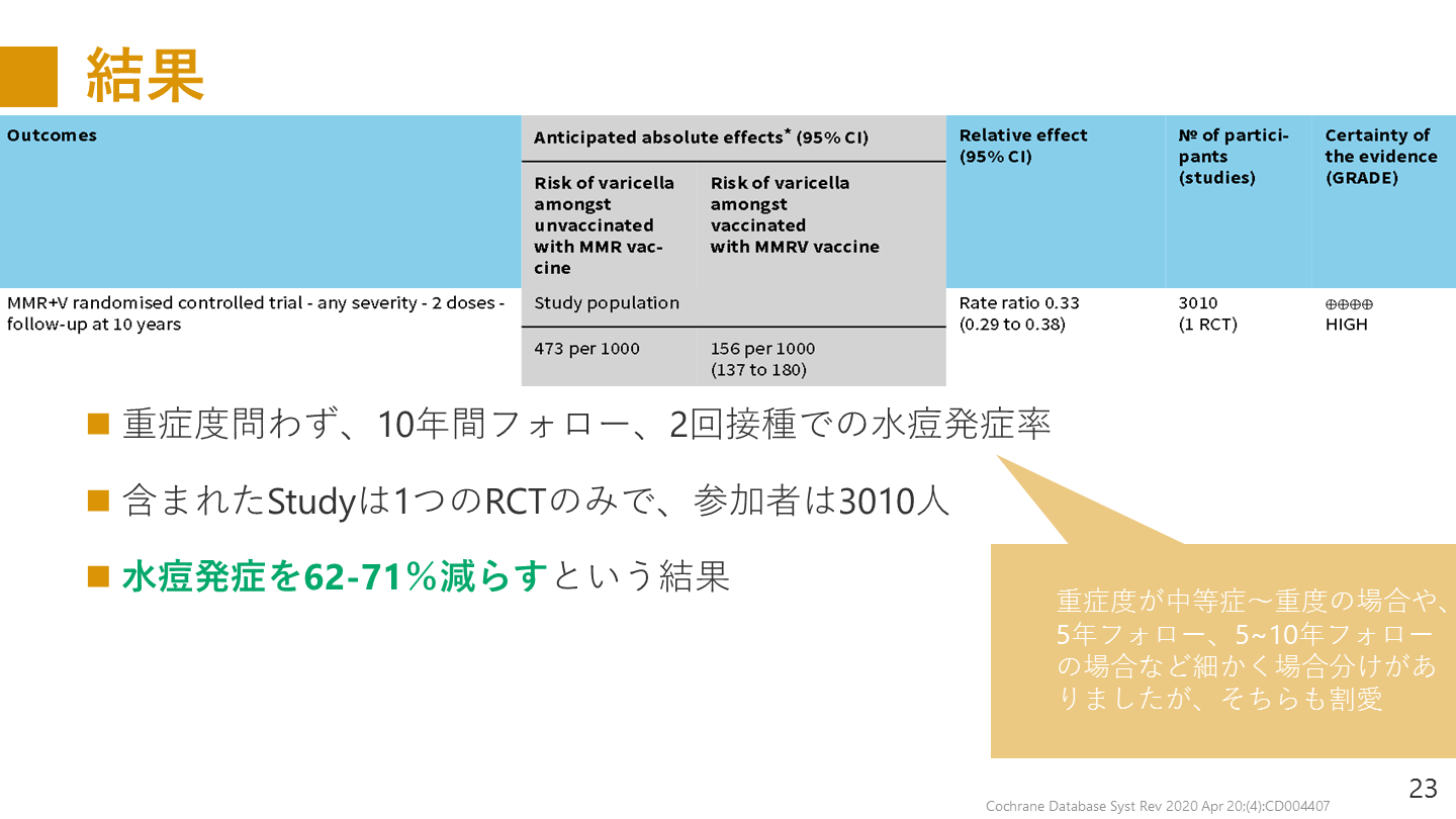 水痘発症を62-71%減らすという結果 23 重症度が中等症~重度の場合や、5年フォロー、5~10年フォローの場合など細かく場合分けがありましたが、そちらも割愛