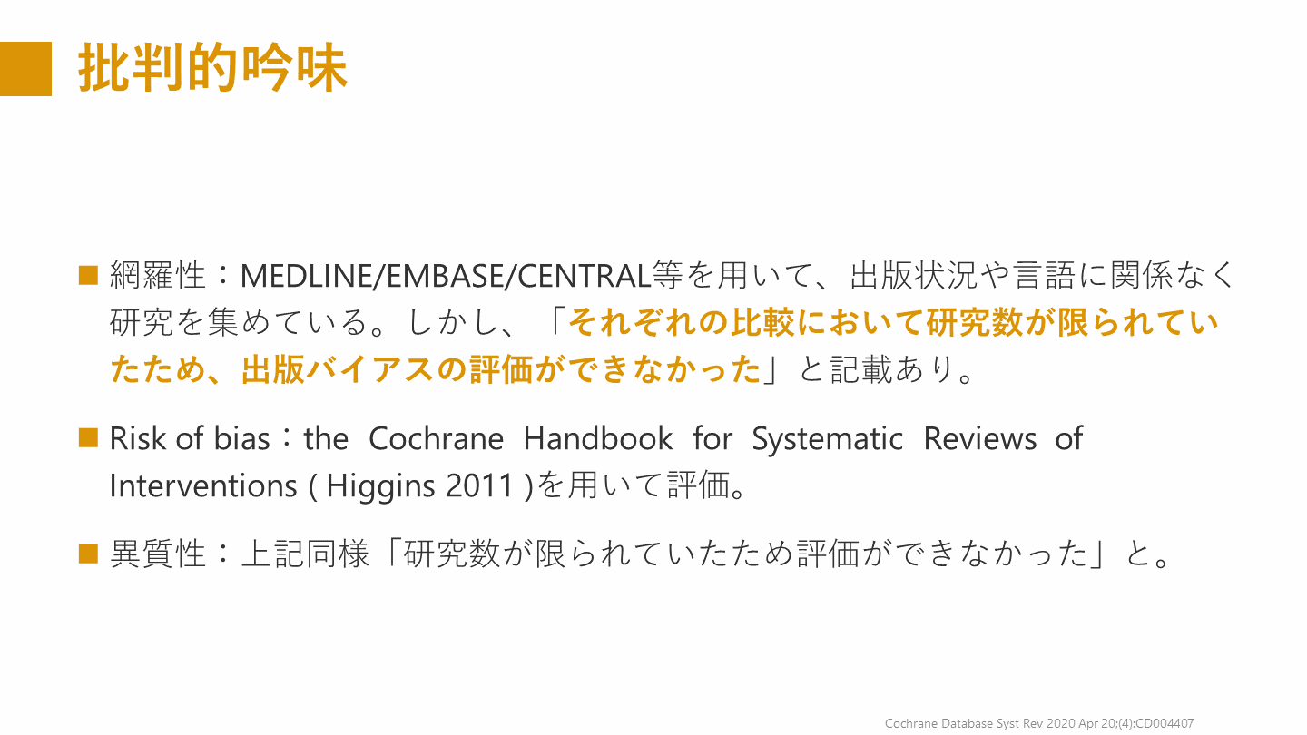 #24. 批判的吟味 Cochrane Database Syst Rev 2020 Apr 20;(4):CD004407 網羅性:MEDLINE/EMBASE/CENTRAL等を用いて、出版状況や言語に関係なく研究を集めている。しかし、「それぞれの比較において研究数が限られていたため、出版バイアスの評価ができなかった」と記載あり。