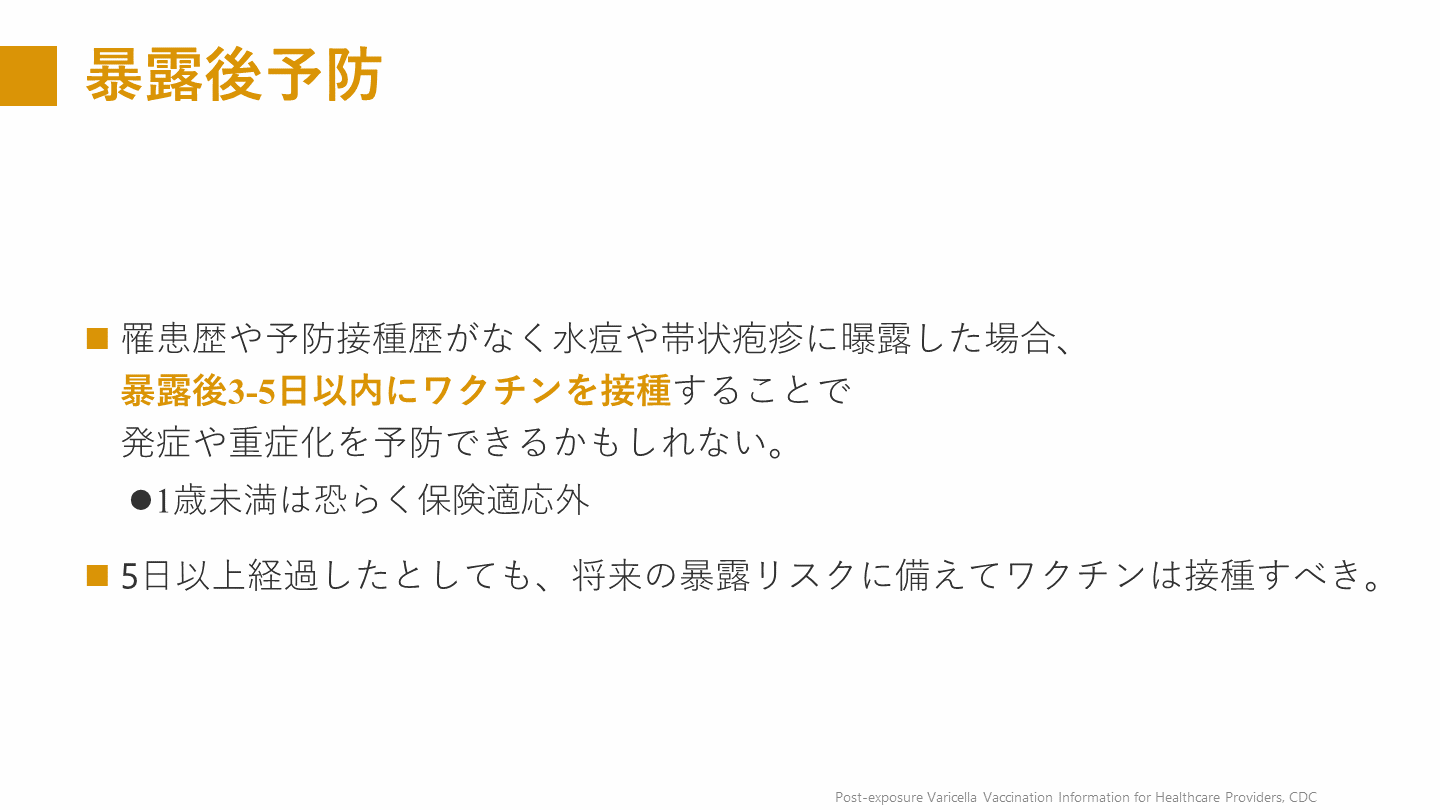 #25. 暴露後予防 Post-exposure Varicella Vaccination Information for Healthcare Providers, CDC 罹患歴や予防接種歴がなく水痘や帯状疱疹に曝露した場合、暴露後3-5日以内にワクチンを接種することで発症や重症化を予防できるかもしれない。