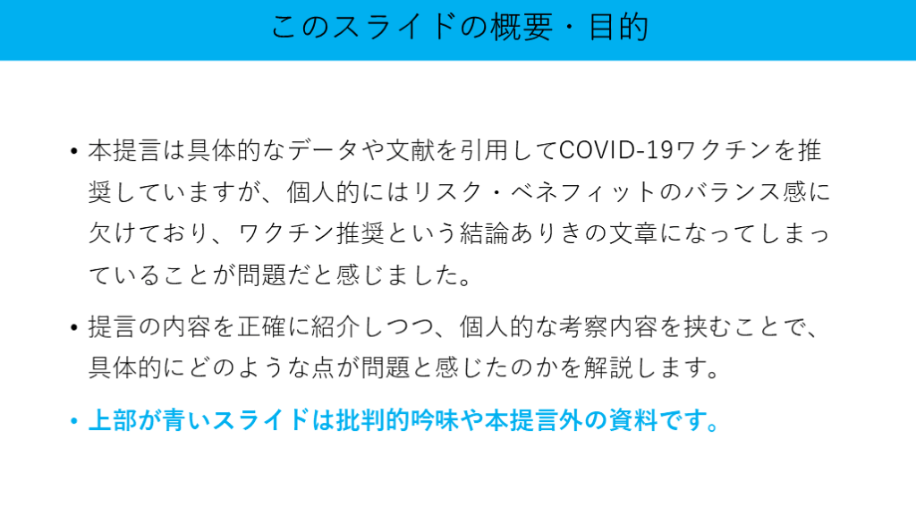 上部が青いスライドは批判的吟味や本提言外の資料です。 このスライドの概要・目的
