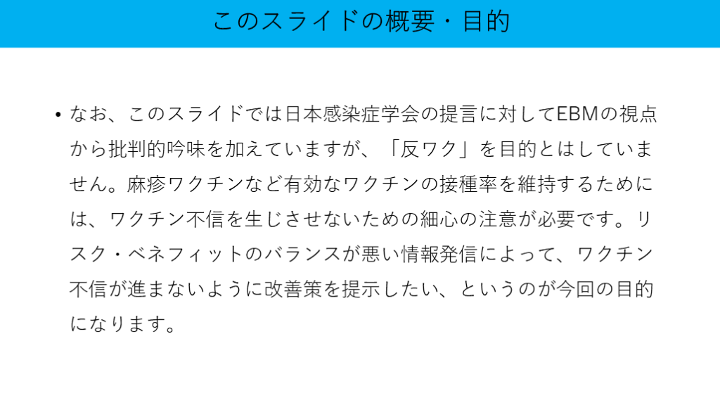 #9. なお、このスライドでは日本感染症学会の提言に対してEBMの視点から批判的吟味を加えていますが、「反ワク」を目的とはしていません。麻疹ワクチンなど有効なワクチンの接種率を維持するためには、ワクチン不信を生じさせないための細心の注意が必要です。リスク・ベネフィットのバランスが悪い情報発信によって、ワクチン不信が進まないように改善策を提示したい、というのが今回の目的になります。 このスライドの概要・目的