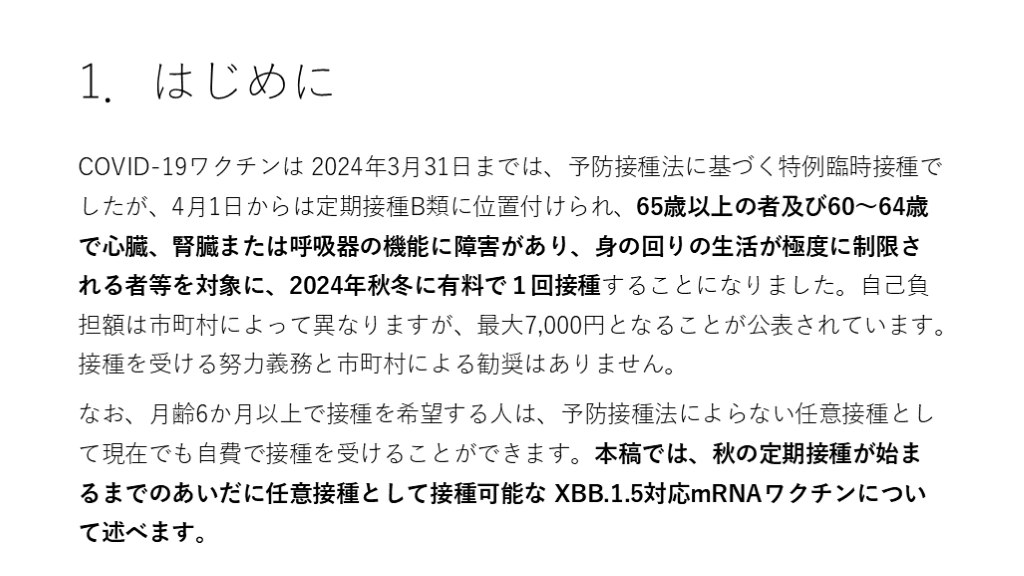 #11. 1.はじめに COVID-19ワクチンは 2024年3月31日までは、予防接種法に基づく特例臨時接種でしたが、4月1日からは定期接種B類に位置付けられ、65歳以上の者及び60~64歳で心臓、腎臓または呼吸器の機能に障害があり、身の回りの生活が極度に制限される者等を対象に、2024年秋冬に有料で1回接種することになりました。自己負担額は市町村によって異なりますが、最大7,000円となることが公表されています。接種を受ける努力義務と市町村による勧奨はありません。