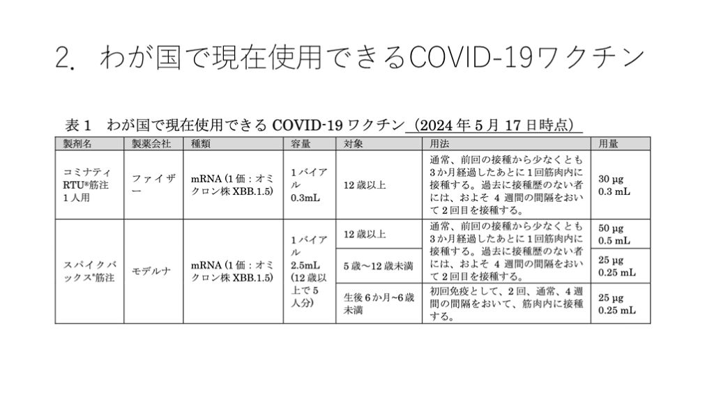日本感染症学会の「COVID-19ワクチンに関する提言」を題材にしていますが、2024年9月作成のスライドですので、内容自体はその時点での知見となります。