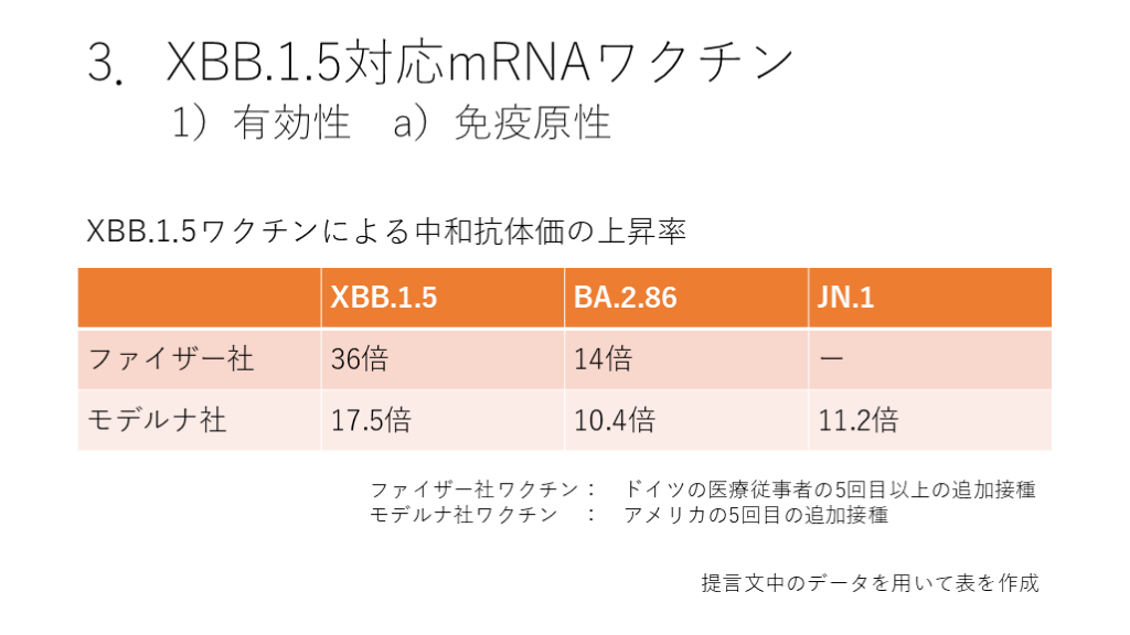 #14. 3.XBB.1.5対応mRNAワクチン 1)有効性 a)免疫原性 上記の結果から、XBB.1.5ワクチンはJN.1に対して、XBB.1.5に対するよりもやや劣るものの、一定の免疫原性を保っていると判断できます。また、いずれの研究においてもCOVID-19 既感染者への接種で JN.1 に対する中和抗体価の上昇が確認されており、数か月以上前に罹っていたとしても新たにXBB.1.5 ワクチンを接種する意義があると考えられます。