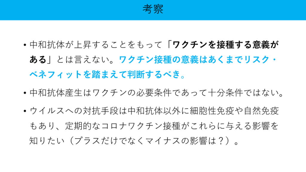 #15. 考察 中和抗体が上昇することをもって「ワクチンを接種する意義がある」とは言えない。ワクチン接種の意義はあくまでリスク・ベネフィットを踏まえて判断するべき。
