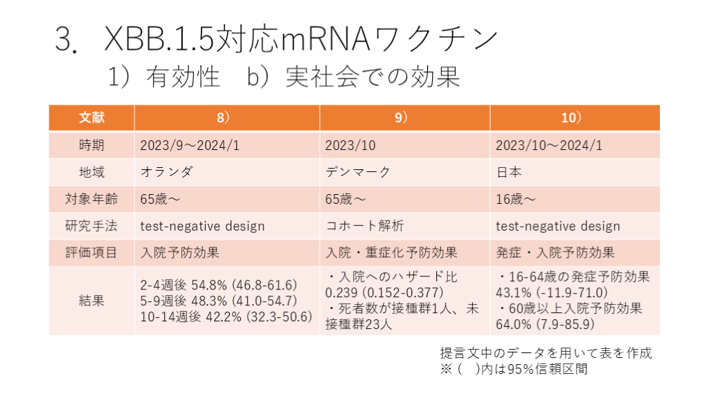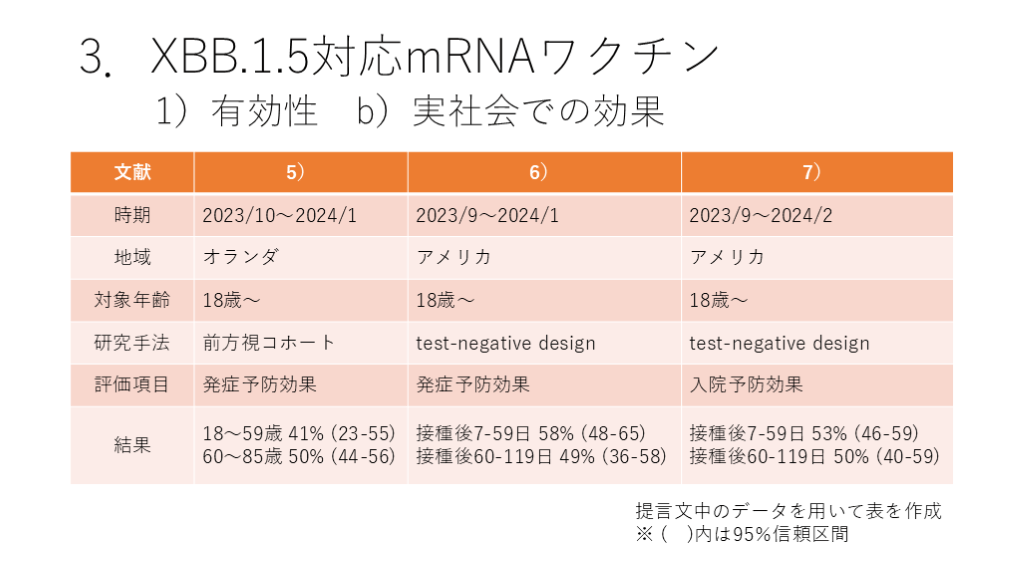 #18. 3.XBB.1.5対応mRNAワクチン 1)有効性 b)実社会での効果 提言文中のデータを用いて表を作成