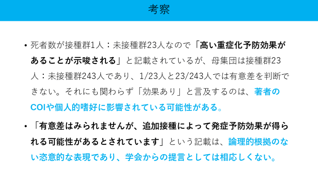 #20. 死者数が接種群1人:未接種群23人なので「高い重症化予防効果があることが示唆される」と記載されているが、母集団は接種群23人:未接種群243人であり、1/23人と23/243人では有意差を判断できない。それにも関わらず「効果あり」と言及するのは、著者のCOIや個人的嗜好に影響されている可能性がある。