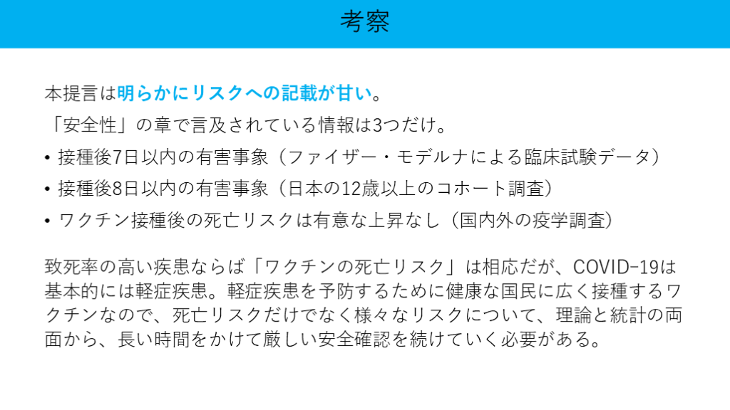 #8. 本提言は具体的なデータや文献を引用してCOVID-19ワクチンを推奨していますが、個人的にはリスク・ベネフィットのバランス感に欠けており、ワクチン推奨という結論ありきの文章になってしまっていることが問題だと感じました。