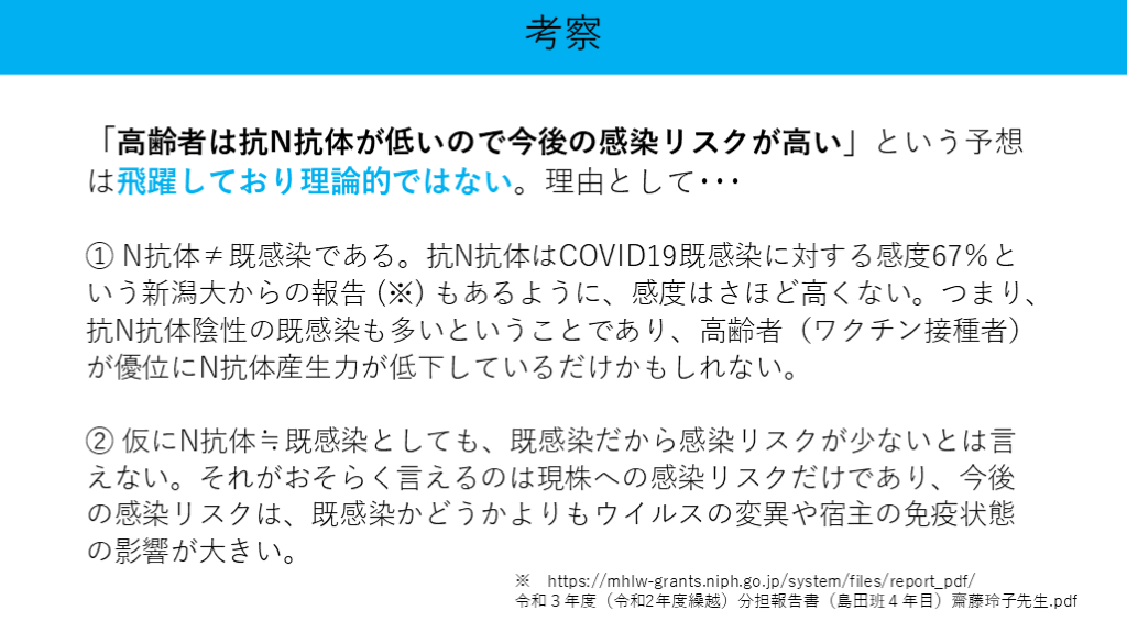 ① N抗体≠既感染である。抗N抗体はCOVID19既感染に対する感度67%という新潟大からの報告 (※) もあるように、感度はさほど高くない。つまり、抗N抗体陰性の既感染も多いということであり、高齢者(ワクチン接種者)が優位にN抗体産生力が低下しているだけかもしれない。