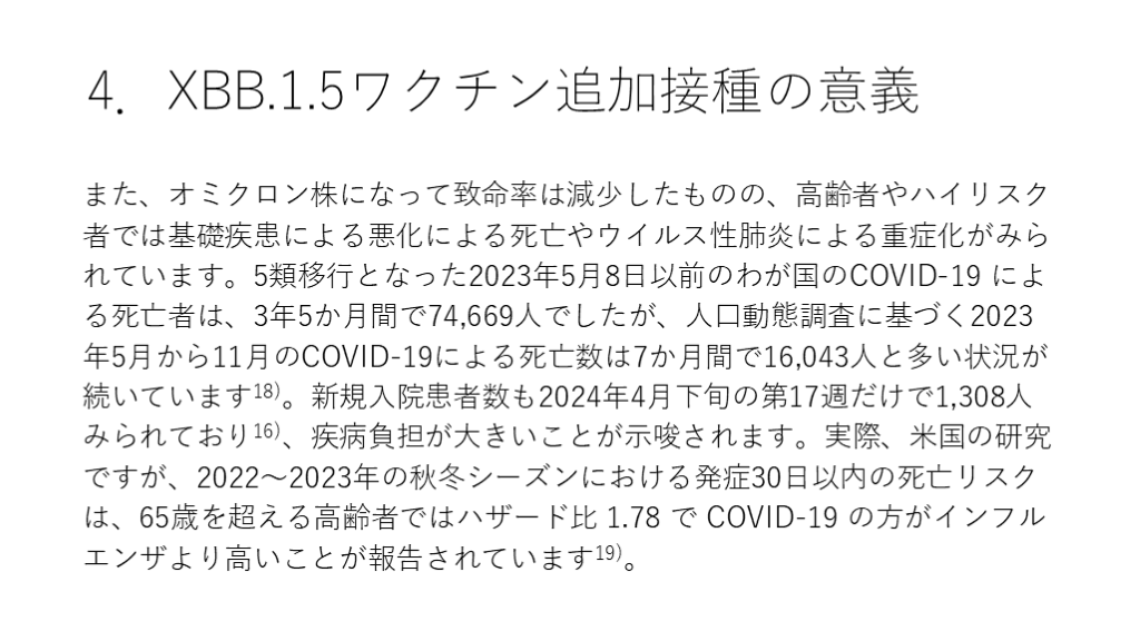 #28. 4.XBB.1.5ワクチン追加接種の意義 また、オミクロン株になって致命率は減少したものの、高齢者やハイリスク者では基礎疾患による悪化による死亡やウイルス性肺炎による重症化がみられています。5類移行となった2023年5月8日以前のわが国のCOVID-19 による死亡者は、3年5か月間で74,669人でしたが、人口動態調査に基づく2023年5月から11月のCOVID-19による死亡数は7か月間で16,043人と多い状況が続いています18)。新規入院患者数も2024年4月下旬の第17週だけで1,308人みられており16)、疾病負担が大きいことが示唆されます。実際、米国の研究ですが、2022~2023年の秋冬シーズンにおける発症30日以内の死亡リスクは、65歳を超える高齢者ではハザード比 1.78 で COVID-19 の方がインフルエンザより高いことが報告されています19)。