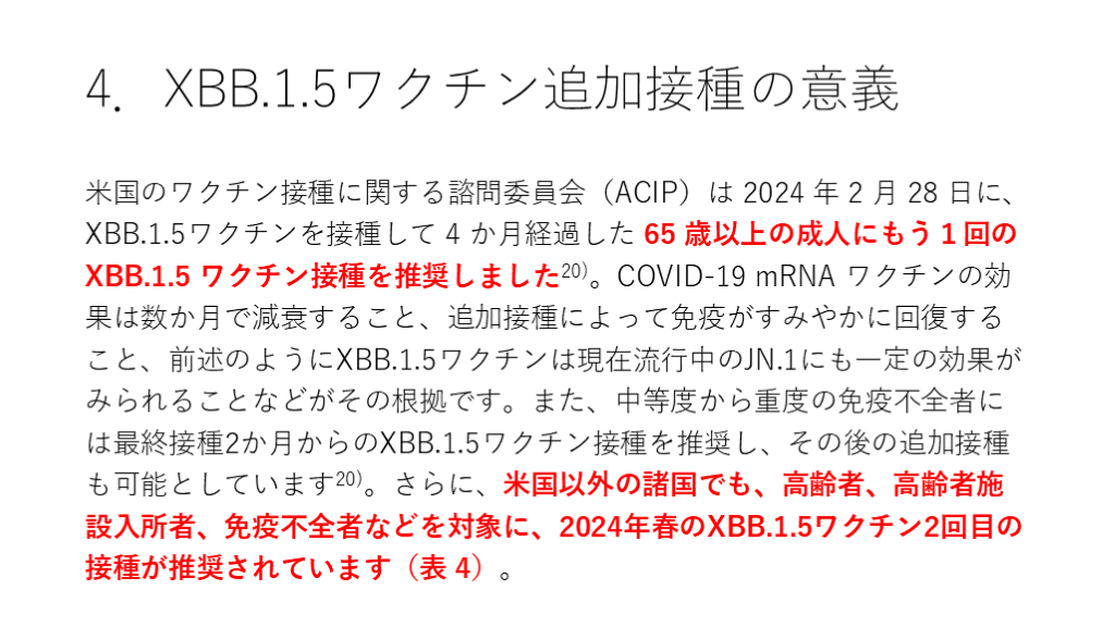 #29. 4.XBB.1.5ワクチン追加接種の意義 米国のワクチン接種に関する諮問委員会(ACIP)は 2024 年 2 月 28 日に、XBB.1.5ワクチンを接種して 4 か月経過した 65 歳以上の成人にもう1回の XBB.1.5 ワクチン接種を推奨しました20)。COVID-19 mRNA ワクチンの効果は数か月で減衰すること、追加接種によって免疫がすみやかに回復すること、前述のようにXBB.1.5ワクチンは現在流行中のJN.1にも一定の効果がみられることなどがその根拠です。また、中等度から重度の免疫不全者には最終接種2か月からのXBB.1.5ワクチン接種を推奨し、その後の追加接種も可能としています20)。さらに、米国以外の諸国でも、高齢者、高齢者施設入所者、免疫不全者などを対象に、2024年春のXBB.1.5ワクチン2回目の接種が推奨されています(表 4)。