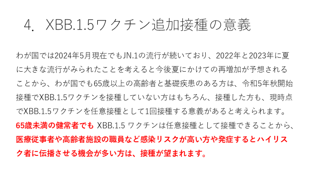 #31. 4.XBB.1.5ワクチン追加接種の意義 わが国では2024年5月現在でもJN.1の流行が続いており、2022年と2023年に夏に大きな流行がみられたことを考えると今後夏にかけての再増加が予想されることから、わが国でも65歳以上の高齢者と基礎疾患のある方は、令和5年秋開始接種でXBB.1.5ワクチンを接種していない方はもちろん、接種した方も、現時点でXBB.1.5ワクチンを任意接種として1回接種する意義があると考えられます。65歳未満の健常者でも XBB.1.5 ワクチンは任意接種として接種できることから、医療従事者や高齢者施設の職員など感染リスクが高い方や発症するとハイリスク者に伝播させる機会が多い方は、接種が望まれます。