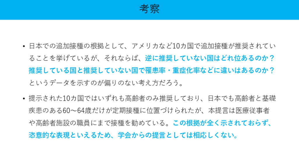 提示された10カ国ではいずれも高齢者のみ推奨しており、日本でも高齢者と基礎疾患のある60〜64歳だけが定期接種に位置づけられたが、本提言は医療従事者や高齢者施設の職員にまで接種を勧めている。この根拠が全く示されておらず、恣意的な表現といえるため、学会からの提言としては相応しくない。