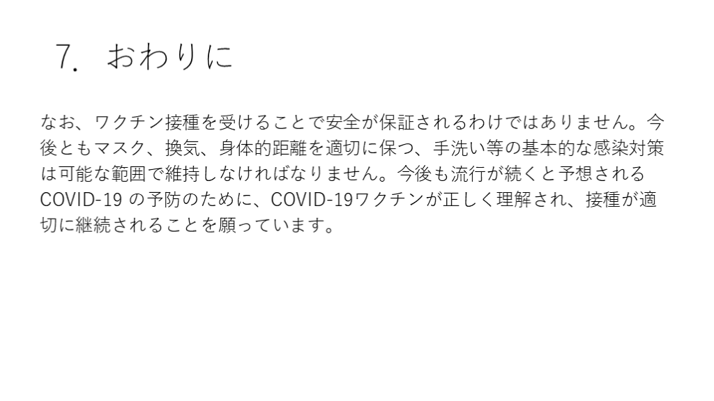 #38. 7.おわりに なお、ワクチン接種を受けることで安全が保証されるわけではありません。今後ともマスク、換気、身体的距離を適切に保つ、手洗い等の基本的な感染対策は可能な範囲で維持しなければなりません。今後も流行が続くと予想されるCOVID-19 の予防のために、COVID-19ワクチンが正しく理解され、接種が適切に継続されることを願っています。