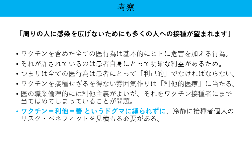 医の職業倫理的には利他主義がよいが、それをワクチン接種者にまで当てはめてしまっていることが問題。