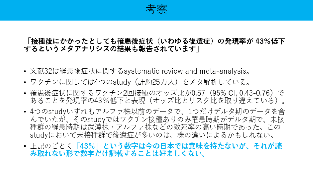#41. 「接種後にかかったとしても罹患後症状(いわゆる後遺症)の発現率が 43%低下するというメタアナリシスの結果も報告されています」