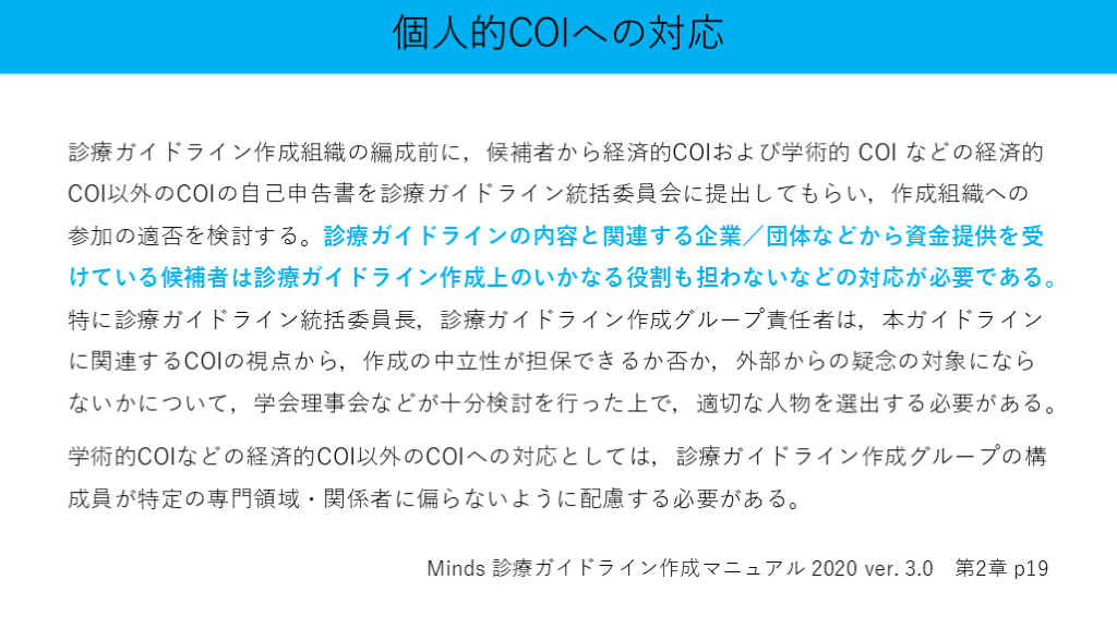 学術的COIなどの経済的COI以外のCOIへの対応としては,診療ガイドライン作成グループの構成員が特定の専門領域・関係者に偏らないように配慮する必要がある。 個人的COIへの対応 Minds 診療ガイドライン作成マニュアル 2020 ver. 3.0 第2章 p19