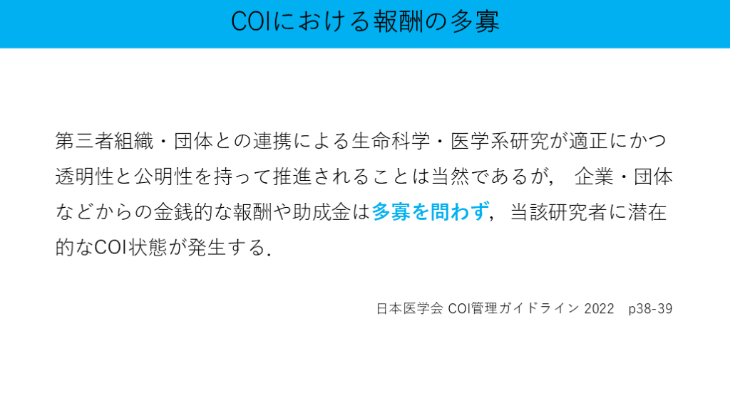 #45. 第三者組織・団体との連携による生命科学・医学系研究が適正にかつ透明性と公明性を持って推進されることは当然であるが, 企業・団体などからの金銭的な報酬や助成金は多寡を問わず,当該研究者に潜在的なCOI状態が発生する. COIにおける報酬の多寡 日本医学会 COI管理ガイドライン 2022 p38-39