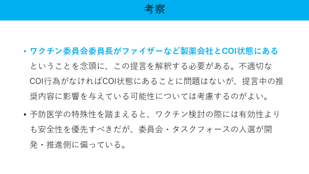 #46. ワクチン委員会委員長がファイザーなど製薬会社とCOI状態にあるということを念頭に、この提言を解釈する必要がある。不適切なCOI行為がなければCOI状態にあることに問題はないが、提言中の推奨内容に影響を与えている可能性については考慮するのがよい。