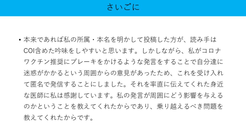 #47. 本来であれば私の所属・本名を明かして投稿した方が、読み手はCOI含めた吟味をしやすいと思います。しかしながら、私がコロナワクチン推奨にブレーキをかけるような発言をすることで自分達に迷惑がかかるという周囲からの意見があったため、これを受け入れて匿名で発信することにしました。それを率直に伝えてくれた身近な医師に私は感謝しています。私の発言が周囲にどう影響を与えるのかということを教えてくれたからであり、乗り越えるべき問題を教えてくれたからです。 さいごに