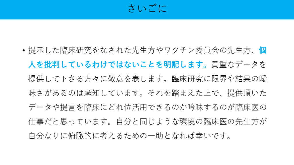 #48. 提示した臨床研究をなされた先生方やワクチン委員会の先生方、個人を批判しているわけではないことを明記します。貴重なデータを提供して下さる方々に敬意を表します。臨床研究に限界や結果の曖昧さがあるのは承知しています。それを踏まえた上で、提供頂いたデータや提言を臨床にどれ位活用できるのか吟味するのが臨床医の仕事だと思っています。自分と同じような環境の臨床医の先生方が自分なりに俯瞰的に考えるための一助となれば幸いです。 さいごに