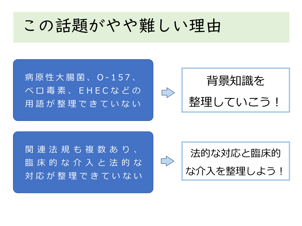 #3. この話題がやや難しい理由 病原性大腸菌、O-157、 ベロ毒素、EHECなどの 背景知識を 用語が整理できていない 整理していこう! 関 連 法 規 も 複 数 あ り 、 法的な対応と臨床的 臨 床 的 な 介 入 と 法 的 な 対応が整理できていない な介入を整理しよう!
