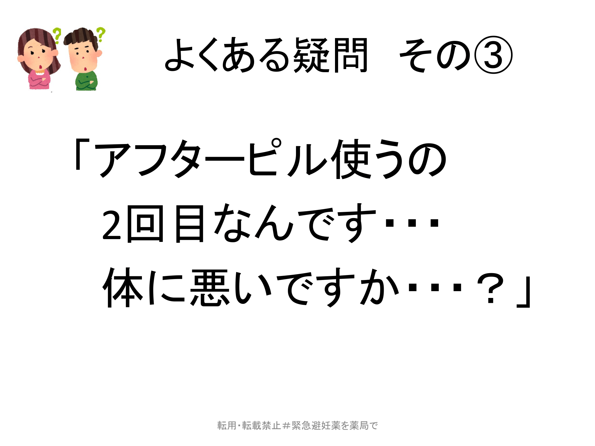 #10. よくある疑問 その③ 「アフターピル使うの 2回目なんです・・・ 体に悪いですか・・・?」 転用・転載禁止#緊急避妊薬を薬局で