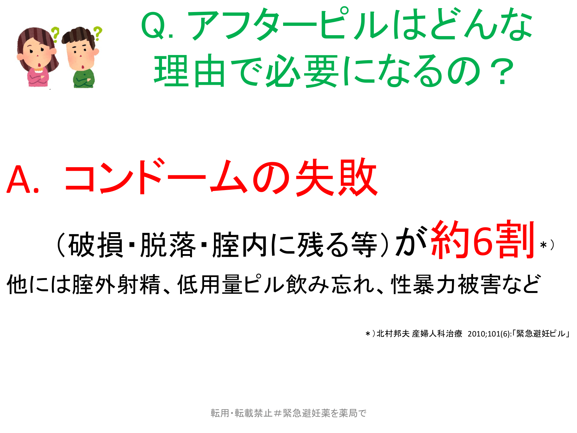 #12. Q. アフターピルはどんな 理由で必要になるの? A. コンドームの失敗 (破損・脱落・腟内に残る等)が約6割*) 他には腟外射精、低用量ピル飲み忘れ、性暴力被害など *)北村邦夫 産婦人科治療 2010;101(6):「緊急避妊ピル」 転用・転載禁止#緊急避妊薬を薬局で